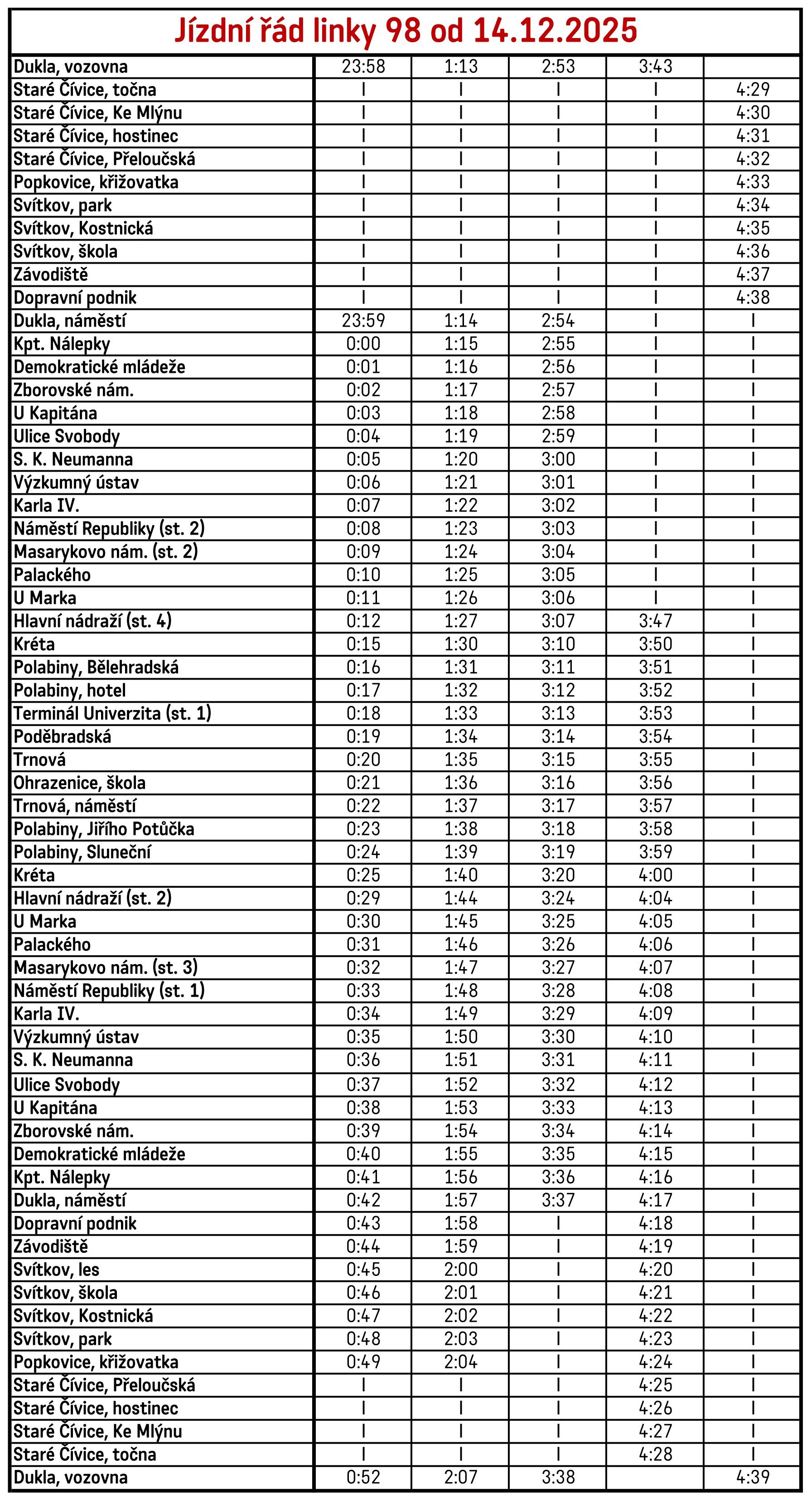 Změny nočního provozu 98 a 99 od 14.12.2025